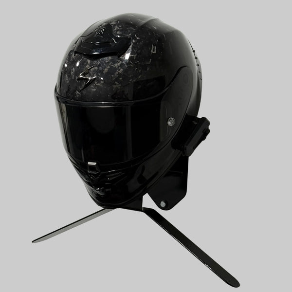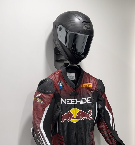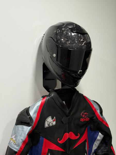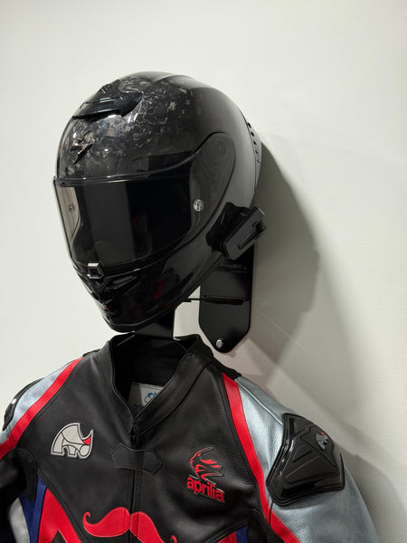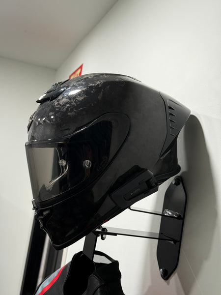 The GRID Wall Mount is a steel, wall-mounted display designed to showcase your helmet and race suit in your garage, shop, or personal space.